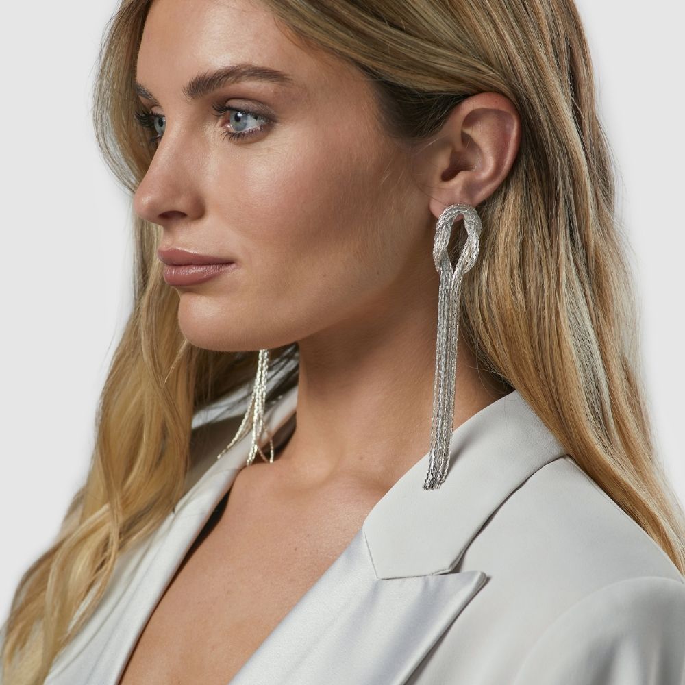 Transform your day wear to an elegant evening look with the silver Studio 54 earrings. Bold and glamorous, the Studio 54 Earrings feature a textured loop design with long, shimmering strands that move beautifully. Made for nights out and special moments, they bring high-impact sparkle and a true disco-era feel.