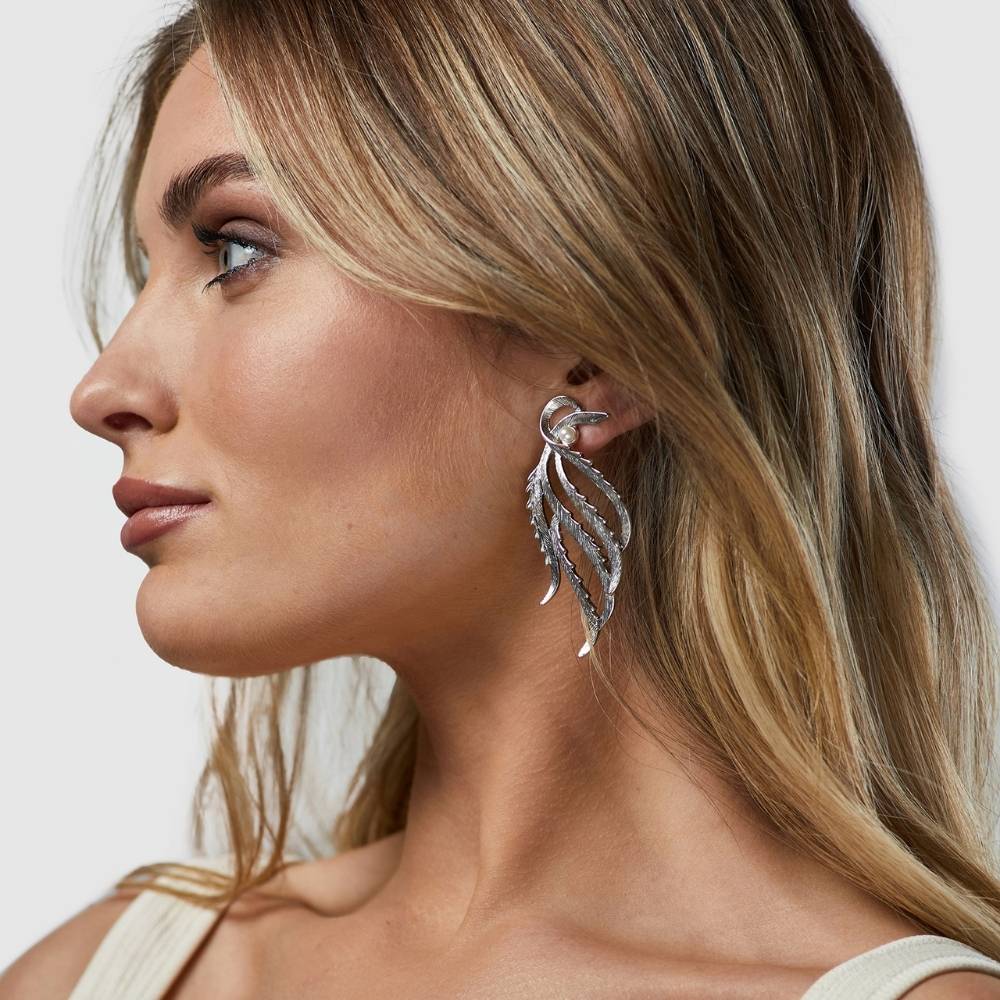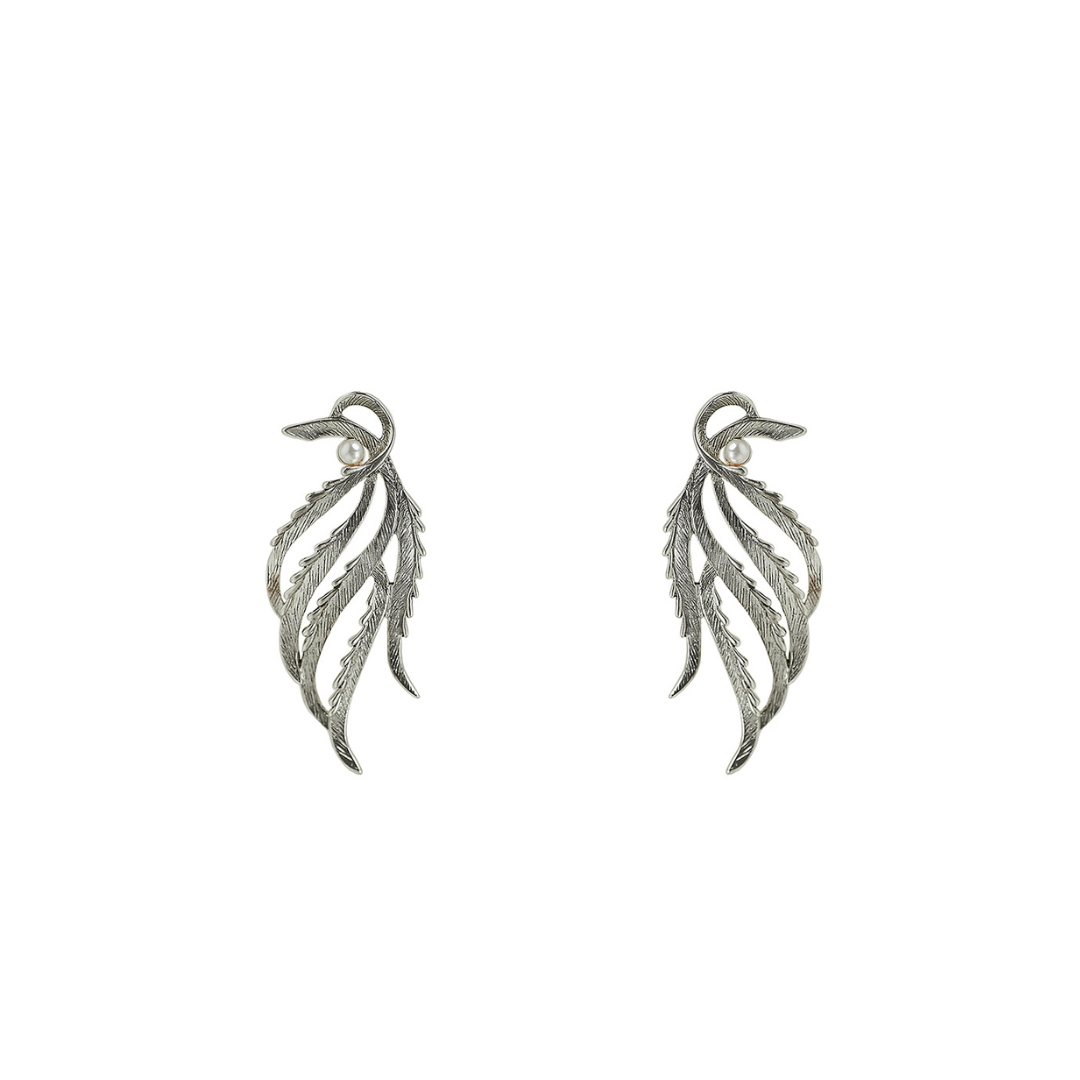 Striking and refined, they frame the face beautifully and bring elevated drama to any look. Graceful and sculptural, the earrings feature a sweeping, feather-inspired silhouette with intricate texture and shine. The Tiny dancer earrings frame the face with a leaf detail and single shell pearl.
