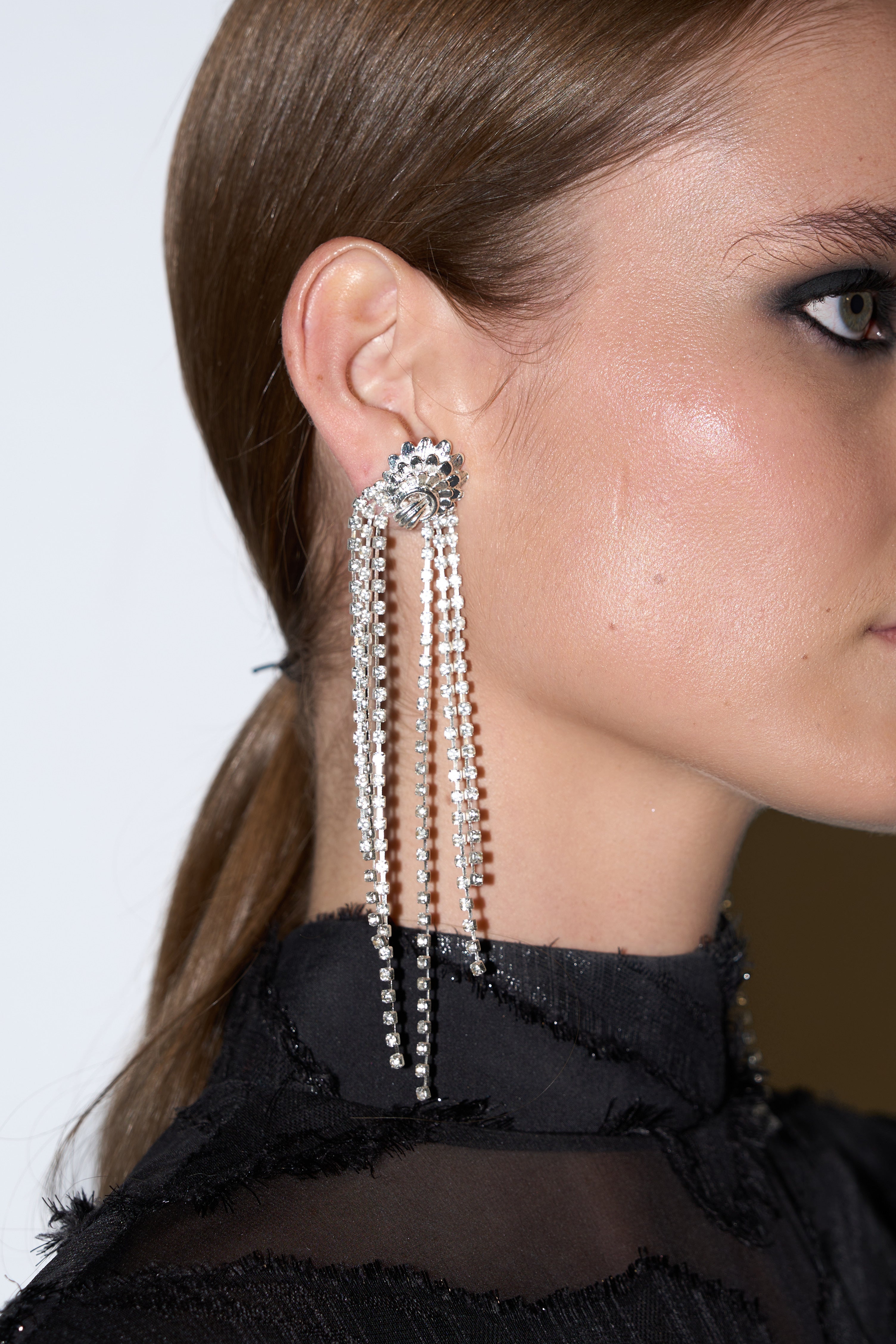 Classic Gatsby vibes. A waterfall of Swarovoski crystals hang from an Art Deco inspired feature that sweep the shoulders. An easy light earring to dress up any outfit.