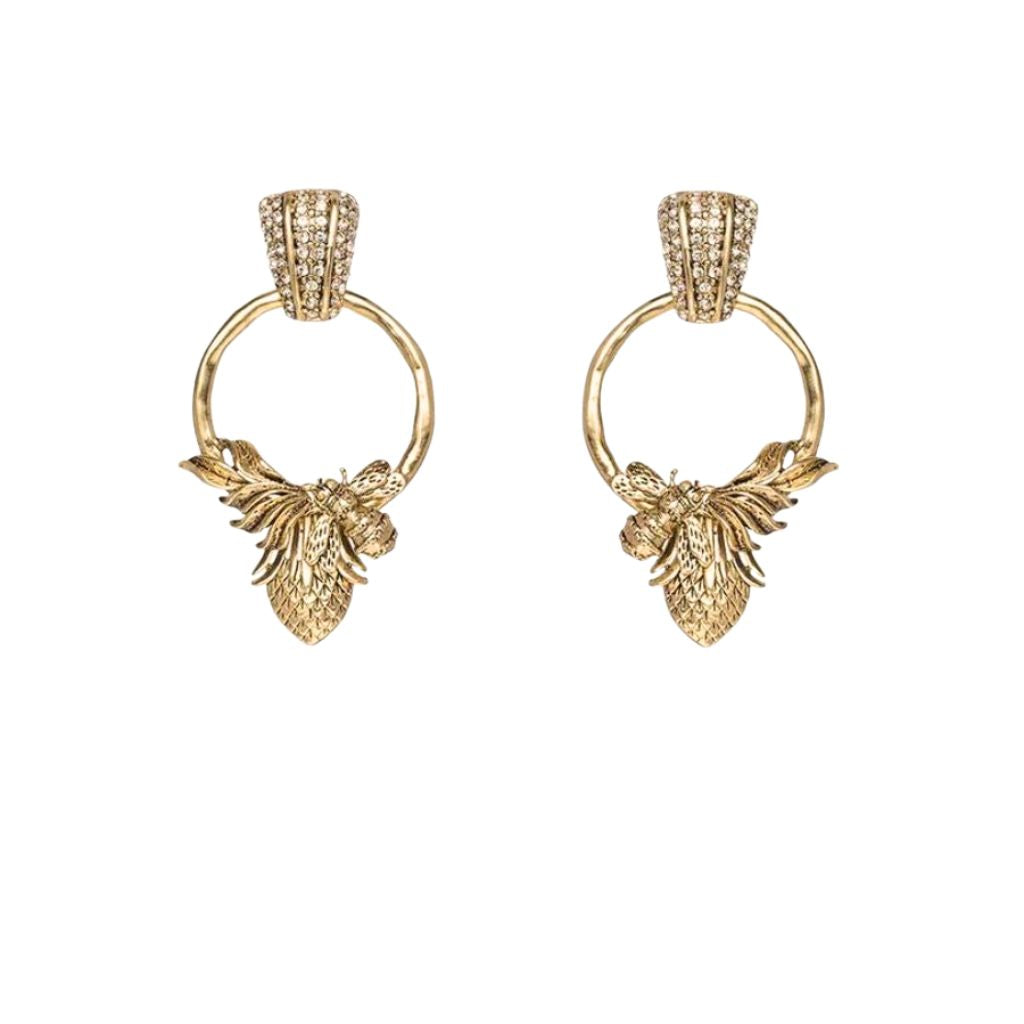 The Abeja Earring by Kitte is a luxury statement gold earring inspired by the flora and fauna of the cuban jungle. This tiered hoop gold earring is embellished with a bee and foliage and studded with Swarovski crystals. Perfect for special occasions and brides to be the Abeja gold earring drops to the jawline.