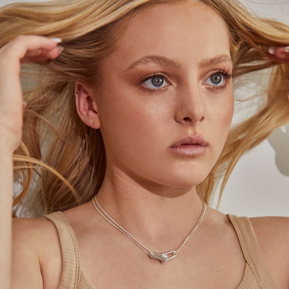 The newest addition to our best-selling Bond Collection, the Baby Bond Pavé Necklace silver features a gorgeous interlinking diamanté hardware on a fine double chain. The links are encrusted with Swarovski stones.