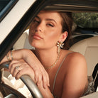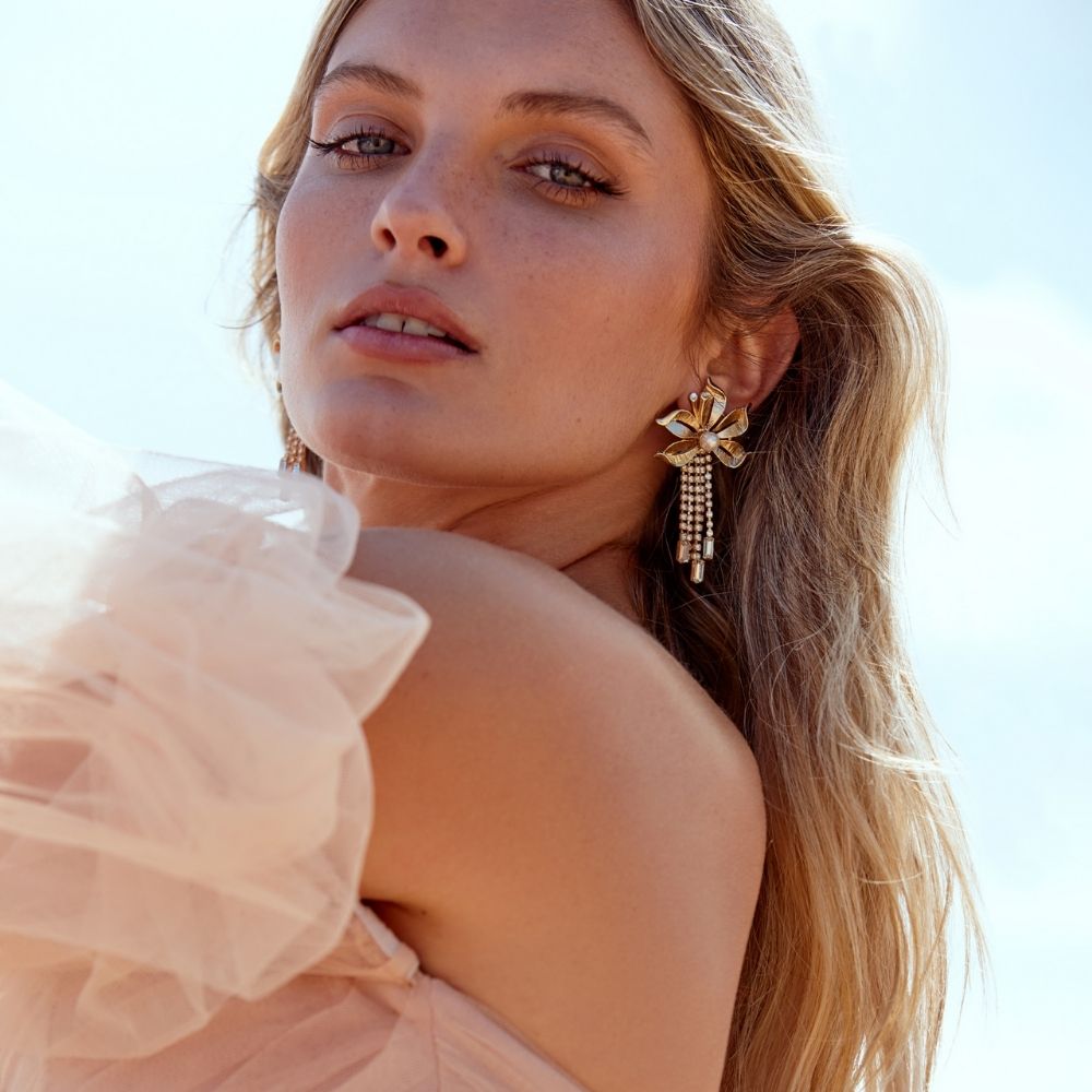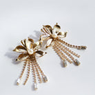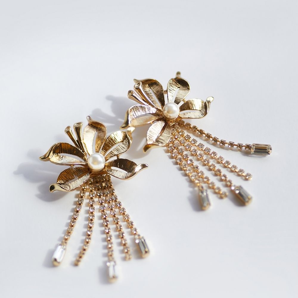 The gold Kitte Ritz earrings feature a pearl-studded flower trailed by a waterfall of diamontes. These gorgeous earrings are a must-have this season.