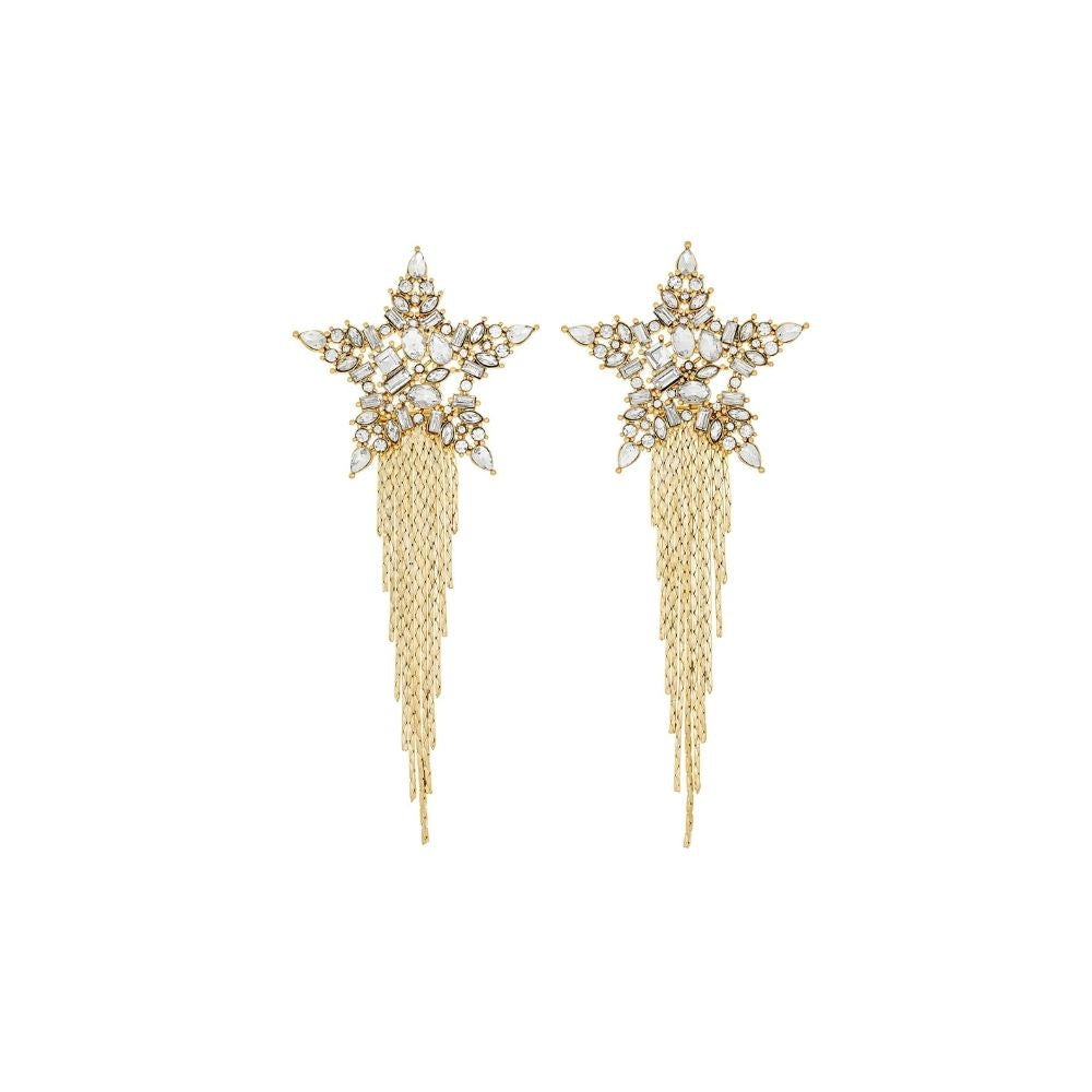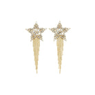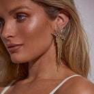 Bold and eye-catching, these long statement earrings feature sparkling stars with strands of shimmery dangling details. Designed to move beautifully with every step, they bring drama, shine, and a playful edge to any outfit.