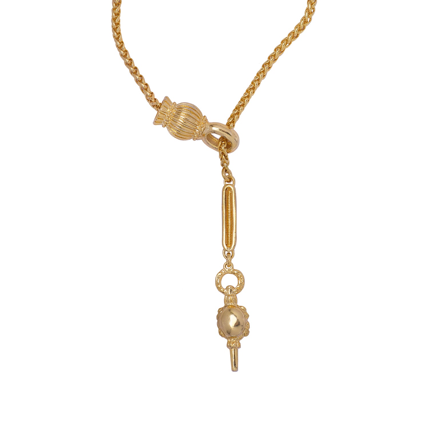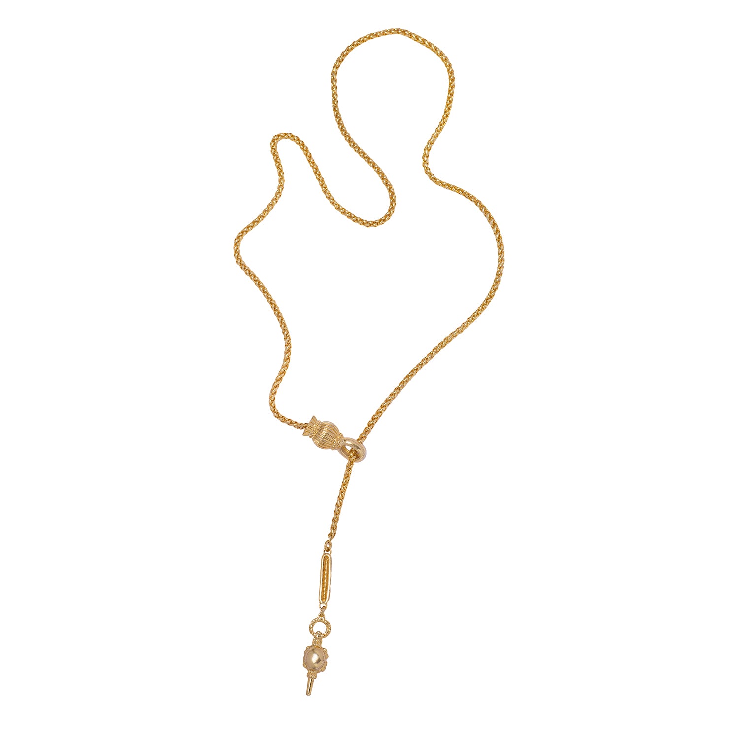 The Aurelia Lariette Necklace by Kitte is a refined statement piece featuring a delicate gold chain with a sculptural clasp inspired by a vintage watch key locket that doubles as a claps and the main feature of this long necklace. Pair with Kitte's Aurelia Earrings.