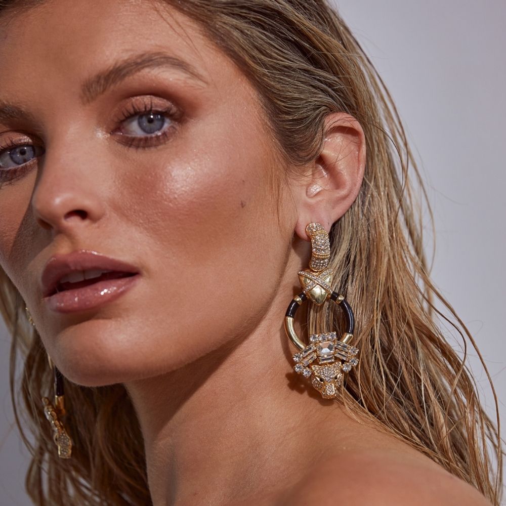 Our jaw-dropping Panthera Jewel earrings feature a diamante-studded half hoop with a shield motif, above a black enamel and gold hoop adorned with a bejewelled panther. Sure to turn heads, these earrings are the perfect statement piece for a special occasion.