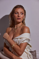 The Kitte Serpent Cuff in gold elegantly wraps around the wearer's wrist, with a gorgeous snake-skin texture and diamante accents. Escape to the jungle with our Zanzibar collection.