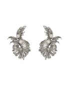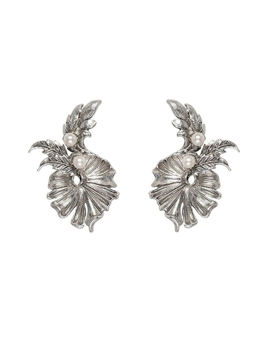 The silver Lotus Garden Earring by Kitte is a floral inspired earring. This elaborate foliage inspired earring features pearl embellishments and sits close to the face. Available in antique gold and silver, this statement earring is perfect for special occasions and brides to be.