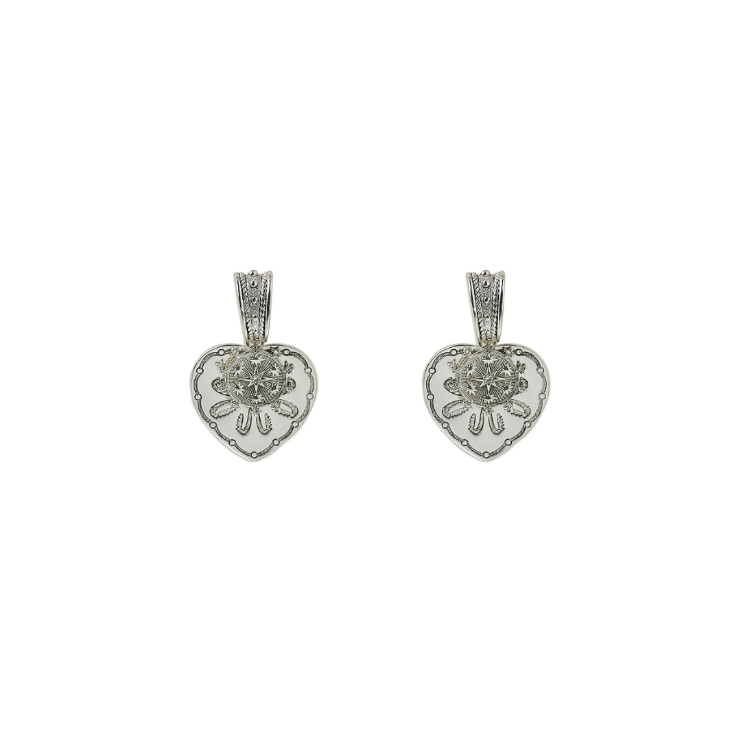 Cute Heart charm earrings with a celestial disc encrusted with tiny crystal stars, suspended from a detailed vintage inspired hoop.