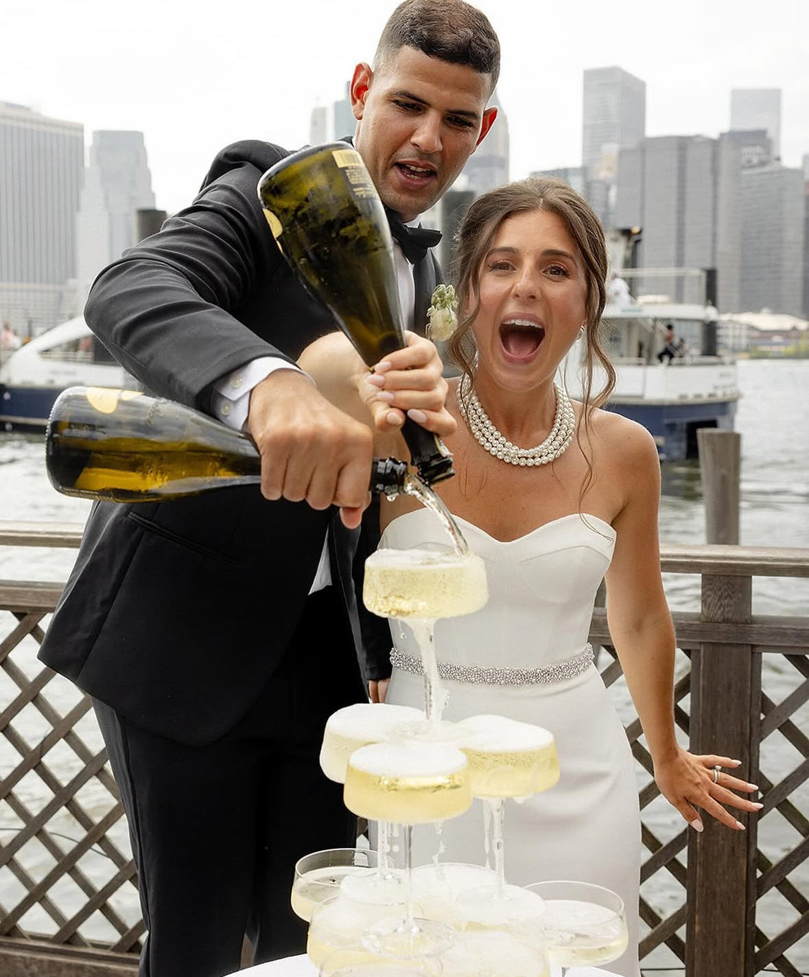 Heather (@heathercolano) looks radiant as she celebrates her love with a champagne tower, dressed in our Forever Pearl necklace and earrings.
