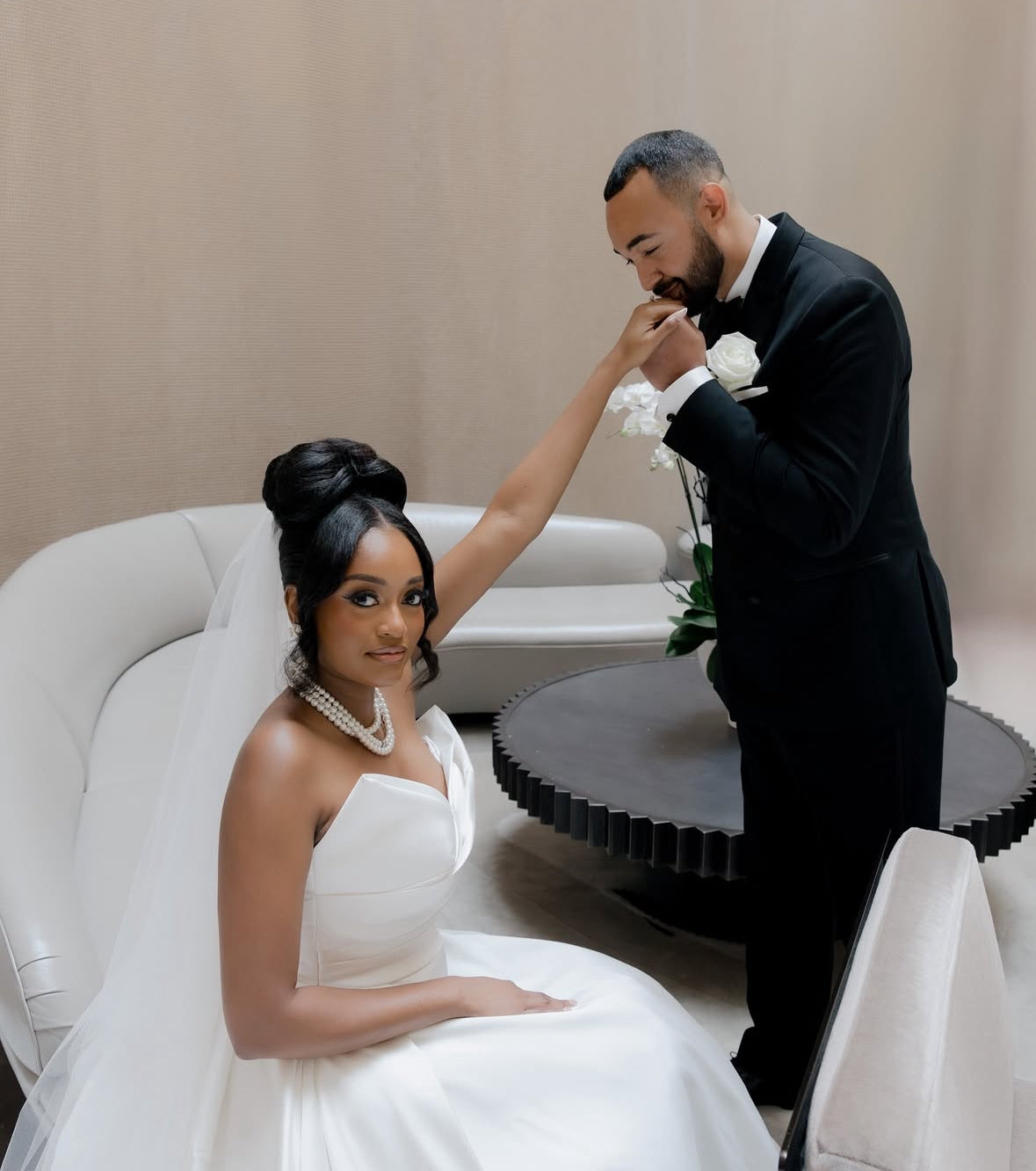 Claire (@clairefrancesse_) takes elegance to a new level with her refined dress, veil, and updo, paired perfectly with our pearls.